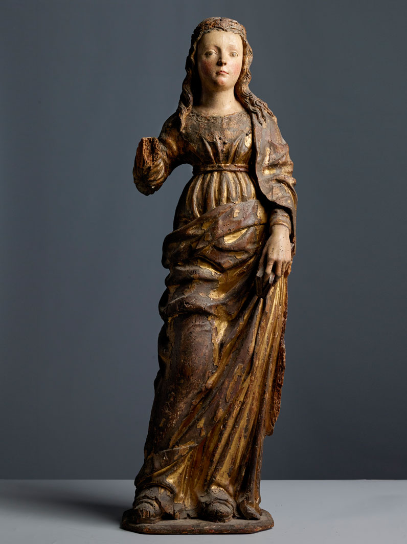 Artiste inconnu, Jeune sainte (autour de 1500) - Cette statue de bois polychromé et doré, de taille respectable (123 cm), a été offerte au MAHF à fin janvier 2018 par une mécène bâloise, qui l'avait acquise sur le marché de l'art en 1977. Les recherches de provenance entreprises par le musée ont établi qu'elle appartenait auparavant à un collectionneur allemand, sans qu'il soit possible de remonter plus haut. L'œuvre pourrait avoir fait partie d'un retable. La sainte qu'elle figure est difficile à identifier. Le livre tenu dans la main gauche pourrait désigner une Vierge de l'Annonciation, souvent nantie de cet accessoire, mais aussi – de même que la couronne ceignant sa chevelure ouverte – la savante sainte Catherine d'Alexandrie. L'origine de cette pièce n'est pas plus facile à déterminer. Sa finesse d'exécution trahit l'atelier d'un maître expérimenté, mais au nord ou au sud de Alpes ? Les experts consultés penchent pour l'Italie septentrionale, Vénétie ou Frioul, à l'écart toutefois des centres principaux.