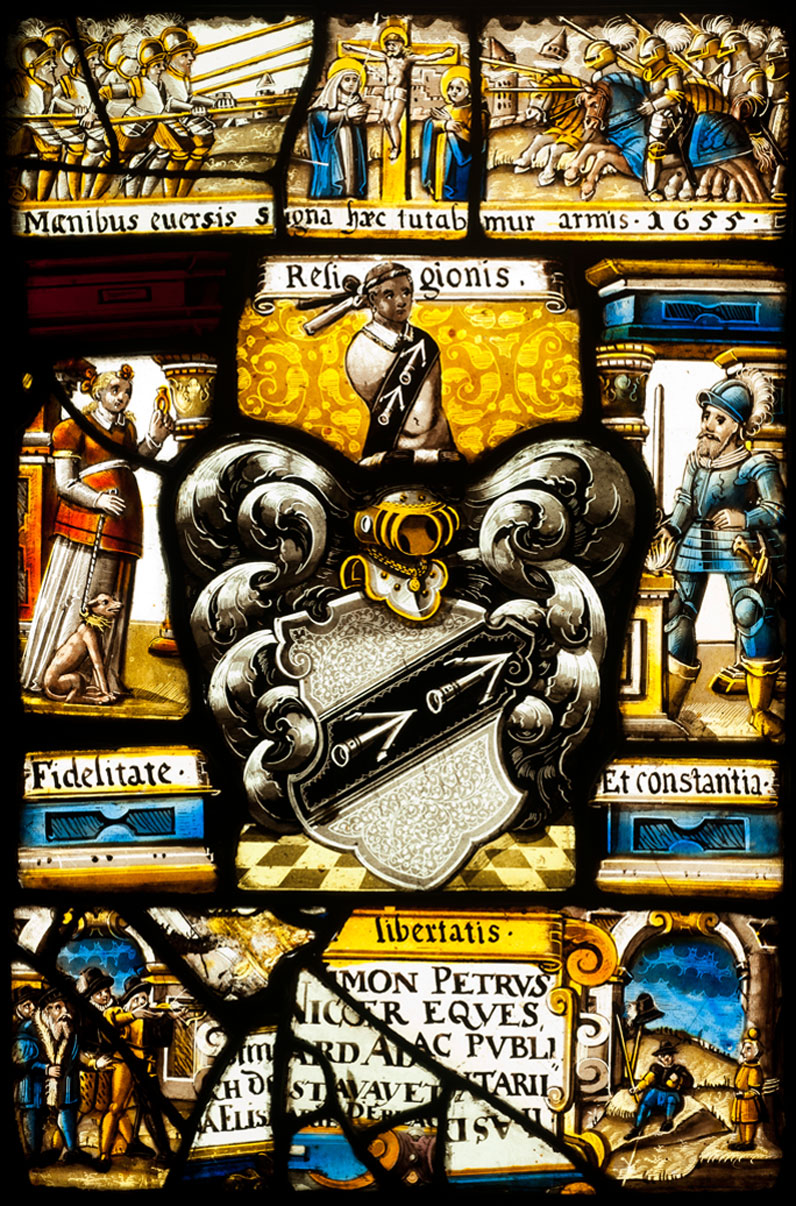Jost Hermann, Vitrail de cabinet aux armes de l’avoyer fribourgeois Simon Peter Meyer (1655) - Ce Vitrail de cabinet aux armes de Simon Peter Meyer, d’origine inconnue, provient du manoir de Balliswil et est attribué au peintre-verrier Jost Hermann et daté de 1655. Tout comme un autre vitrail faisant déjà partie des collections du MAHF (MAHF-2006-245), cette œuvre a été commanditée par Simon Peter Meyer, avoyé, comme en témoigne la mention de son nom et la présence du blason aux armes de la famille qui se trouve au centre du vitrail, disposé à cheval sur un sol en damier et un fond décoratif jaune. Cette armoirie familiale s'accompagne de devises transversales la caractérisant, qui appellent au respect des vertus dépeintes de manière allégorique. Sur la gauche du blason, nous retrouvons, dans un écrin architectural, « Fidelitate » (la fidélité). La silhouette féminine nous présente dans sa main gauche un anneau et tient de sa main droite un chien en laisse, symbole de fidélité. A droite de l’armoirie, figure « Constantia » (la fermeté), représenté sous les traits d’un guerrier armé tenant résolument sa main droite dans le feu. En dessous du blason, l’inscription « Libertatis » est symbolisée par le tire de Guillaume Tell dans la pomme, alors que dans la partie supérieure du vitrail, la représentation de la crucifixion avec l’épithète « Religionis » renvoie à la foi en la religion catholique, appuyée par la présence de la devise suivante : « Nous défendrons par les armes les signes détruits par les mains ». Cette phrase doit être comprise dans le contexte des tensions confessionnelles de l’époque : la destruction des signes fait référence aux vagues d’iconoclasme ébranlant la foi catholique, et la devise appelle donc au maintien de cette religion en combattant le protestantisme. Ainsi, l’iconographie du vitrail associée aux vertus qu’il exalte, renvoie un message clairement contre-réformateur : en demeurant fermement fidèle à la foi catholique, le croyant demeure libre.