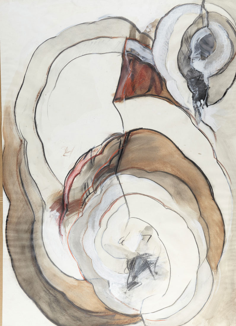 « Cycle de dix œuvres sur papier" donation du Fonds National de Recherche Scientifique Suisse à Berne, MAHF 2018-086 - Né en 1941, Bruno Baeriswyl passe son enfance en Vieille-Ville où le peintre autodidacte Ernest Riesemey est son inspirateur. En 1957, il travaille dans une fabrique de cartonnage et crée des emballages. Les débuts de sa carrière interviennent en 1958-1962, années pendant lesquelles il développe une technique mixte utilisant des cendres. En 1962, 1963 et 1969, il obtient la Bourse fédérale des beaux-arts qui encourage sa vocation. En 1964, il est admis comme membre de la SPSAS. L’artiste meurt en 1996 à Fribourg. La série "Cycle de dix œuvres sur papier" constitue l'un des premiers projets d’envergure de l’artiste dans le contexte du grand format. Elle est réalisée en 1977 pour le Fonds National de Recherche Scientifique Suisse à Berne. Les données architecturales du lieu imposent à l'artiste une décoration murale, située entre le plafond bas, à caissons, et le niveau de la troisième estrade de la salle. Face à ce défi, il exécute une série de dix œuvres dont il varie les dimensions. Outre l'alternance des formats, il opte pour un accrochage audacieux, concentré en majeure partie, sur l'une des parois de la salle et alternant, de manière irrégulière, les intervalles entre les tableaux. Les dix tableaux sont conçus telles des variations sur un thème unique : la forme ronde, en spirale, faite de structures dynamiques et organiques qui s'imbriquent ou se superposent. Concernant le choix des couleurs, l'artiste utilise les tonalités rouge, ocre, noire, grise et brune dont il varie l'intensité et l'association à chaque nouvelle composition. L’ensemble est de grande qualité et représente un cycle puissant et cohérent, témoignant du talent de l’artiste.