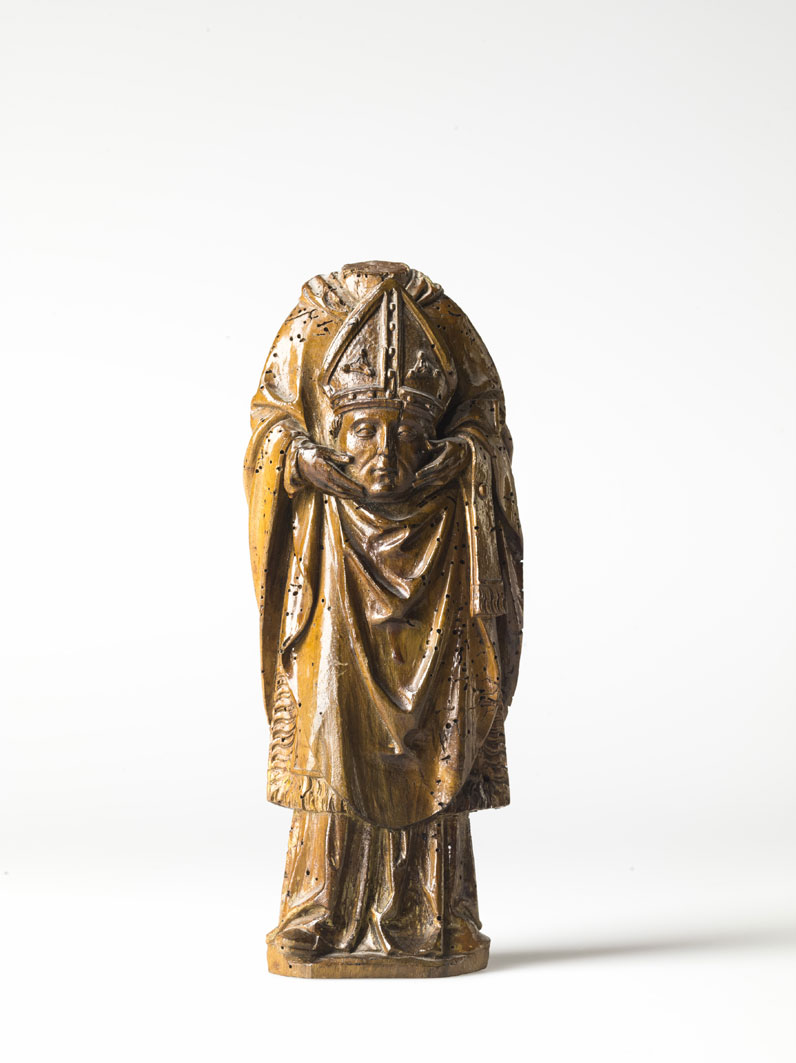 Cette sculpture de petite taille en bois de noyer est apparue en 2008 sur le marché de l’art. Après avoir été en possession d’Hermann Schöpfer, elle a été achetée par le musée en 2018. D’après l’information donnée par le vendeur, elle devait provenir d’une ancienne collection privée fribourgeoise, mais cela n’a pu être prouvé. La statuette représente un évêque portant sa tête dans ses mains. Ce type de saints est appelé céphalophore («porteur de tête»). Dans notre cas, il s’agit de saint Denis, missionnaire arrivé en Gaule au IIIe siècle et rapidement devenu évêque de Paris. Décapité sur ordre du gouverneur romain, Denis aurait ramassé sa tête tombée et l’aurait portée depuis Montmartre, lieu de son exécution, jusqu’à l’endroit où il souhaitait être enterré. En ce lieu, à six kilomètres au nord du centre-ville, le roi Dagobert Ier a fait construire, en 626, une abbaye dédiée à Saint-Denis, devenue par la suite la nécropole des rois de France. Saint Denis est alors considéré comme saint patron de la maison royale française, et finalement le saint national de la France toute entière. En raison de son style, la statuette est datable des années 1520-1530. Elle présente certaines similitudes avec les œuvres fribourgeoises du XVIe siècle, sans pour autant pouvoir être mise en lien direct avec elles. Au sein de ce vaste corpus, le noyer est surtout utilisé pour les sculptures du sud-ouest du canton. Celles-ci sont difficiles à classer, en effet, alors que certaines d’entre elles appartiennent au milieu culturel savoyard, d’autres répètent le type fribourgeois dans un style différent. MAHF 2019-004