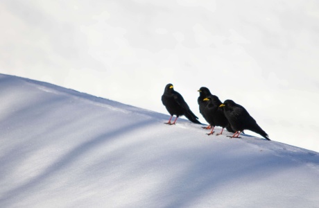 Ces chocards à becs jaune, aussi parfois appelés « choucas », sont des opportunistes. Ils se nourrissent habituellement de fruits en hiver, mais n’hésitent pas à s’approprier des graines ou des miettes de sandwich dérobés aux skieurs. Au-delà de leur petit côté hitchcockien, leurs prouesses aériennes ainsi que leurs cris délicats font partie intégrante du charme des montagnes, été comme hiver.