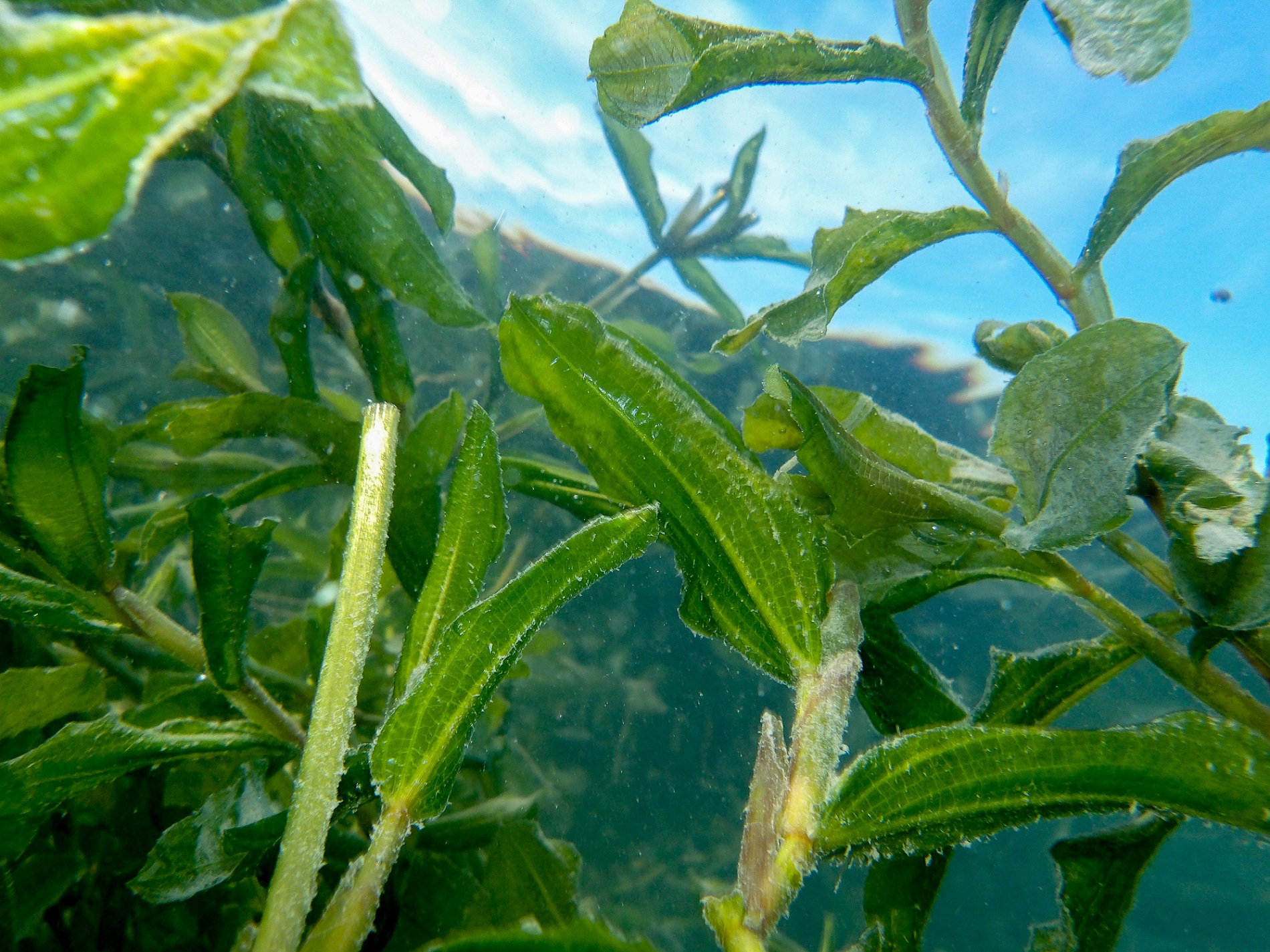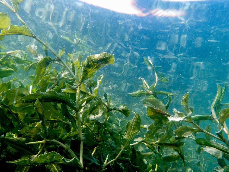 C’est dans la partie un peu plus profonde du lac qu’apparaissent les potamots. Le plus grand d’entre eux, le potamot luisant, peut même atteindre six mètres de haut pour aller effleurer la surface. Il produit des épis qui dépassent tout juste de l’eau et qui sont pollinisés par le vent. Bien que le terme d’"algue" est très utilisé dans le langage courant pour désigner tout ce qui pousse sous l’eau, ces végétaux ne sont pas des algues, mais des plantes terrestres qui se sont adaptées à vivre sous l’eau.