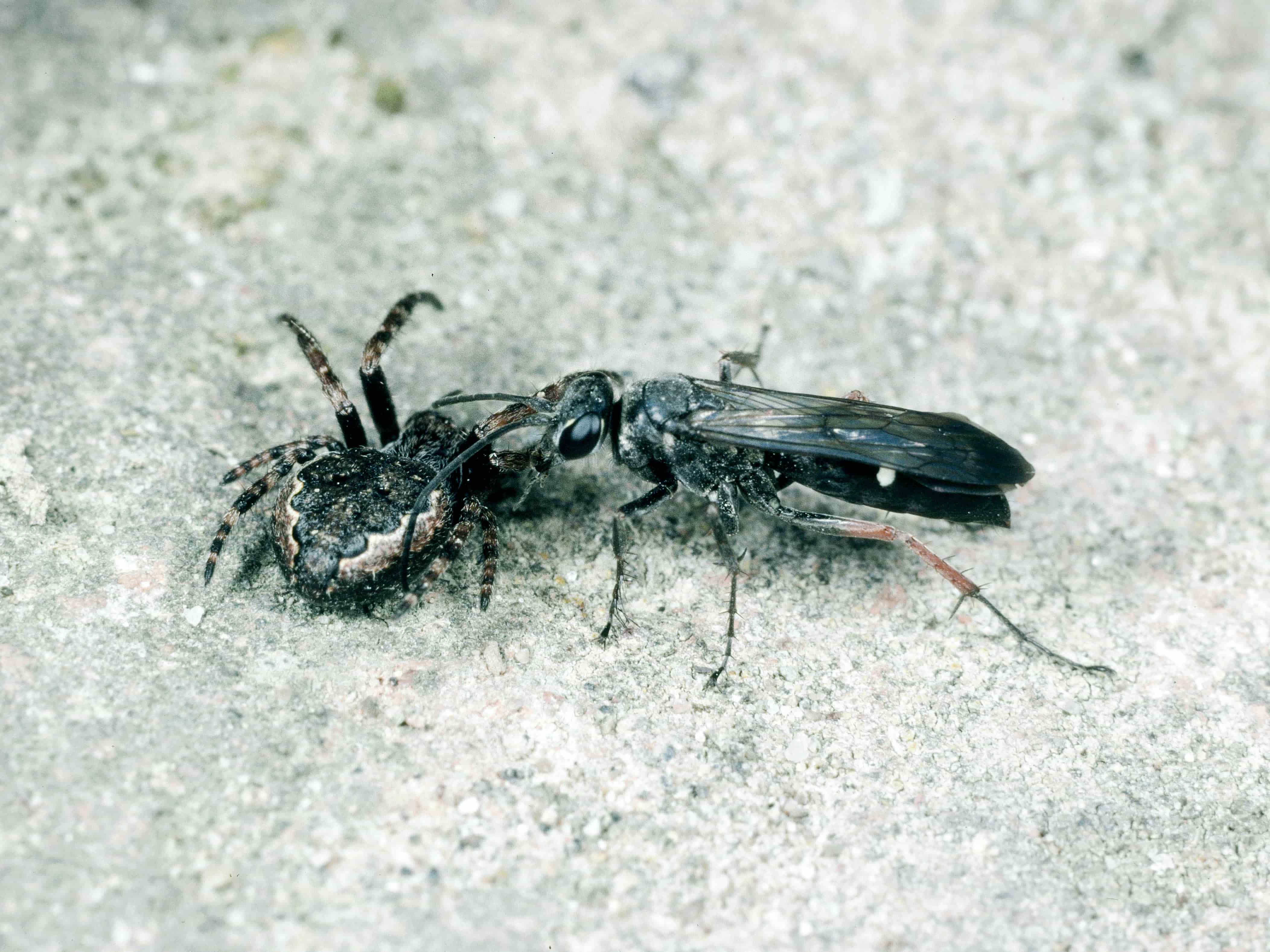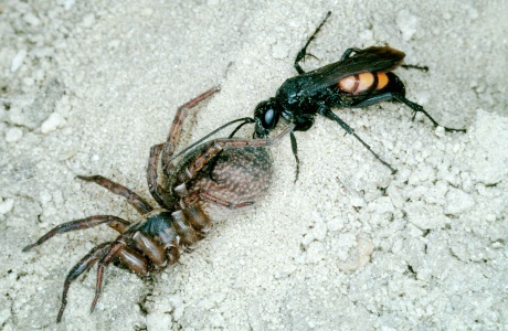 Si le chien est le meilleur ami de l’homme, la guêpe pompile est la meilleure amie des arachnophobes. Cette agile prédatrice est le cauchemar des araignées, qu’elle chasse pour nourrir sa progéniture. Souvent noires ou rouges, avec de longues pattes, les différentes espèces de pompiles se reconnaissent à leur comportement typique : elles se déplacent par petits sauts et font vibrer frénétiquement leurs ailes lorsqu'elles chassent.