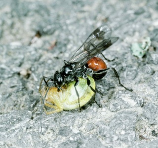 Une fois l’araignée attrapée, la guêpe pompile la paralyse avec son dard et la traîne dans un trou dans le sol. Là, elle pond un œuf sur son corps. La larve fraîchement éclose dévore alors petit à petit l’araignée vivante, jusqu’au stade final où la nouvelle guêpe émerge ne laissant derrière elle que les restes de son festin. Un scénario digne d’un film d’horreur, et pourtant tiré tout droit de la nature !