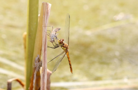 Un peu plus loin au bord de l’étang, un sympétrum strié vient tout juste d’émerger de sa dernière peau larvaire. Pour éviter que le froid n’ait raison de lui, il fera partie des milliers de libellules migratrices qui passeront les cols en octobre et novembre pour trouver dans le sud des températures plus clémentes.