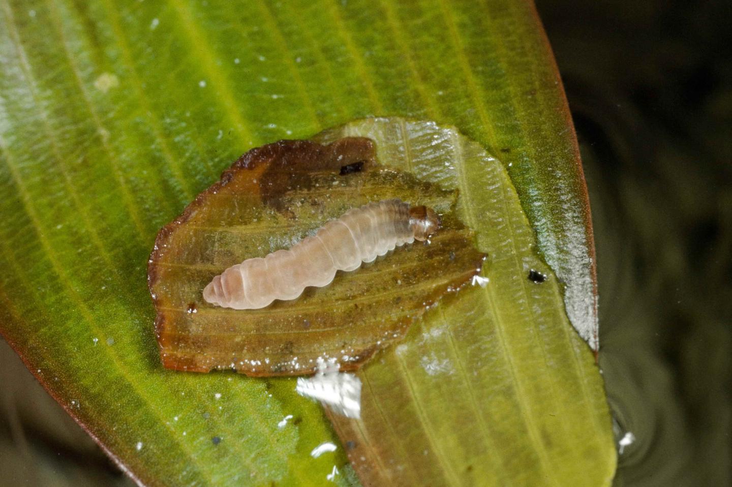 D’un aspect peu intéressant au premier abord, la chenille de l’Hydrocampe du potamot cache en réalité un mode de vie très original. Comme d’autres espèces de sa sous-famille, elle vit sous l’eau et respire par la peau. Pour se protéger, elle construit un fourreau fait de deux morceaux de feuilles cousues ensemble par des fils de soie. Cachée dans cette enveloppe, elle n’a alors qu’à sortir la tête pour se régaler de feuilles de plantes aquatiques. En grandissant, la chenille perd peu à peu sa capacité à respirer par la peau et emprisonne un coussin d’air dans son fourreau pour se déplacer avec sa propre réserve d’oxygène. Enfin mature, elle se transforme alors en chrysalide et après une quinzaine de jours, un papillon émerge sous l’eau. Il atteint laborieusement la surface pour finalement se mettre en sécurité sur une feuille sèche. Ainsi, après sa vie aquatique, ce papillon peut commencer sa nouvelle vie aérienne et nocturne.