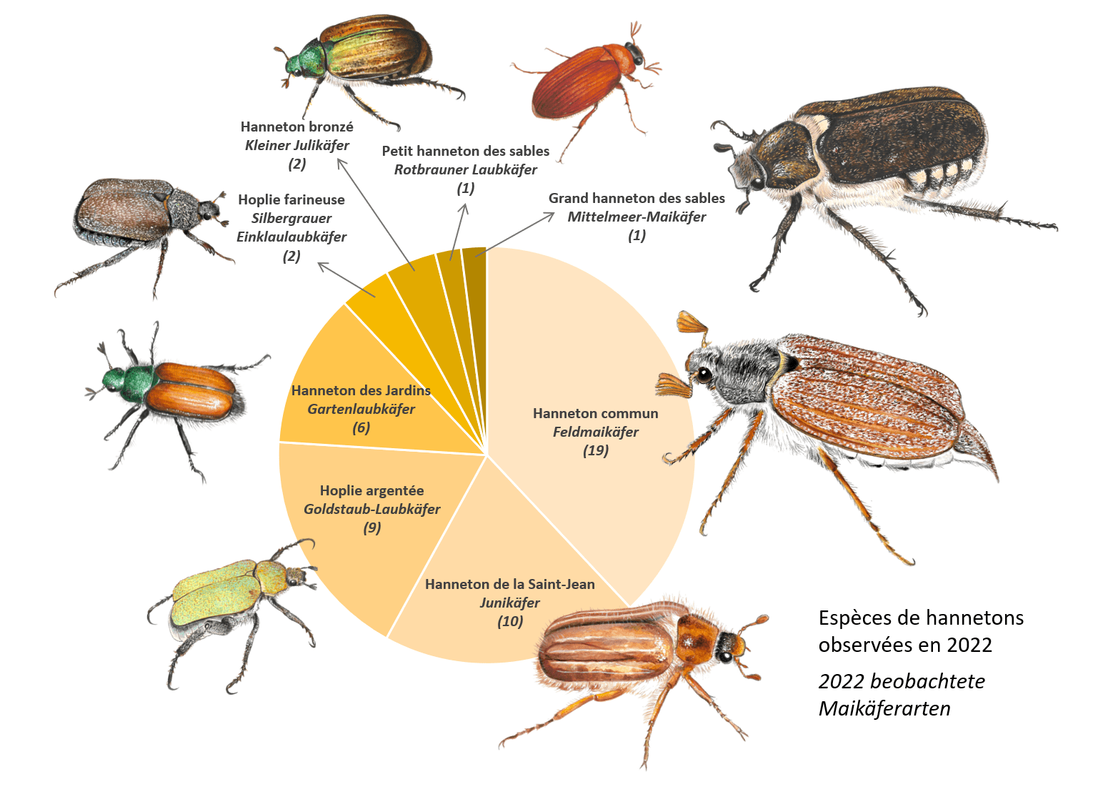 Parmi les 50 observations de hannetons envoyées au MHNF, 48 sont fribourgeoises et 2 proviennent des cantons de Vaud et de Berne. Au total, 8 espèces différentes ont été trouvées, principalement durant les mois de mai et de juin. La médaille d’or du nombre de vues revient sans conteste au Hanneton commun, observé 19 fois cet été, suivi du Hanneton de la Saint-Jean et de l’Hoplie argentée. Le Hanneton des jardins a été ponctuellement observé dans le canton et c’est à noter que des classes d’école de Tavel et de Heitenried ont découvert l’Hoplie farineuse et le Petit hanneton des sables, des espèces peu fréquentes. Bravo à elles ! Le Hanneton bronzé a aussi été vu non loin d’Estavayer-le-Lac et de Planfayon, des données intéressantes pour ce scarabée lié aux milieux sableux. Pour finir, le Grand hanneton des sables a été retrouvé par des entomologistes dans le canton de Berne. Une bonne nouvelle pour cet insecte difficile à observer en Suisse.