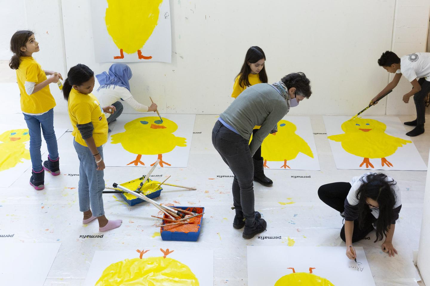 C’est dans l’atelier de René Walker, artiste et graphiste de l’exposition, que la magie a opéré. En sa compagnie, les enfants se sont lancés sans hésiter dans la peinture libre d’affiches grand format. Les seules consignes portaient sur les couleurs à utiliser (jaune, orange et bleu) et la thématique globale : les fameux poussins. Le travail accompli a été documenté et sera présenté sous la forme d’un film dans l’exposition.