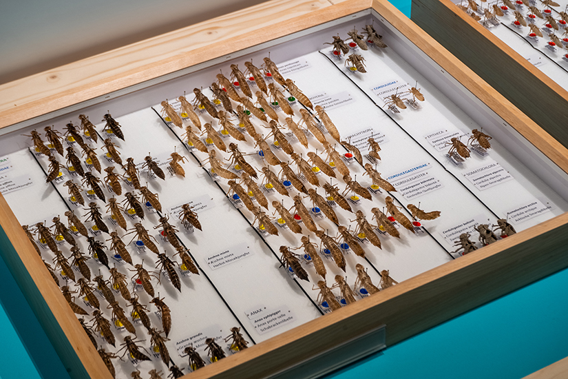 L’exposition présente les résultats de l’inventaire, la nouvelle collection d’exuvies mais aussi la biologie de la libellule : son cycle de vie, son existence aquatique puis aérienne, ses performances de vol...