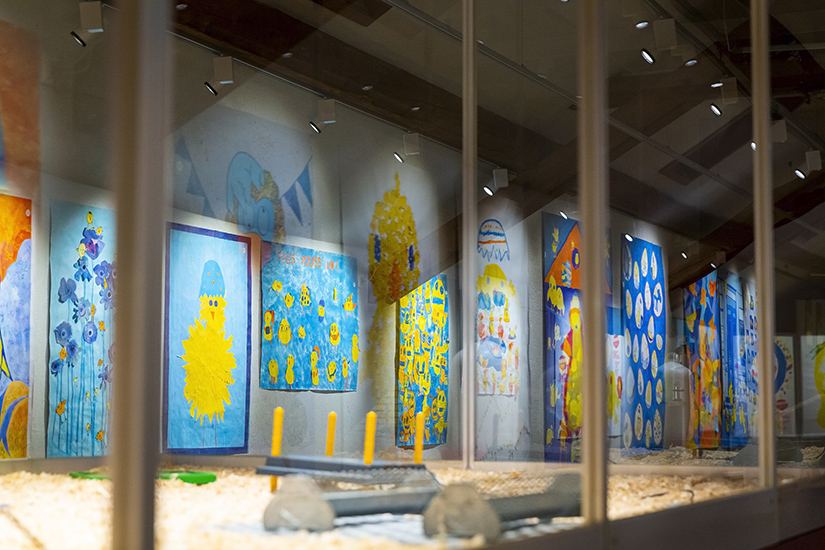 Comme l’attente du retour des poussins fut longue, et les temps moroses, le Musée a invité la population, âgée de 5 à 113 ans, à apporter une contribution créative à l’exposition. La consigne était simple : dessiner un ou des poussins dans la technique de son choix, mais en se limitant à trois couleurs : le jaune, l’orange et le bleu.
