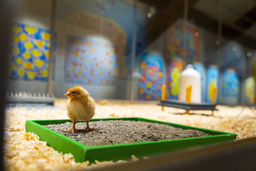 Comme son titre l'indique, l’exposition se présente dans une version allégée et se concentre sur l’essentiel. Vous pourrez y voir les poussins dans une poussinière agrandie et surélevée, les petits becs qui percent les coquilles d’oeuf dans les couveuses – et peut-être même assister à une éclosion.