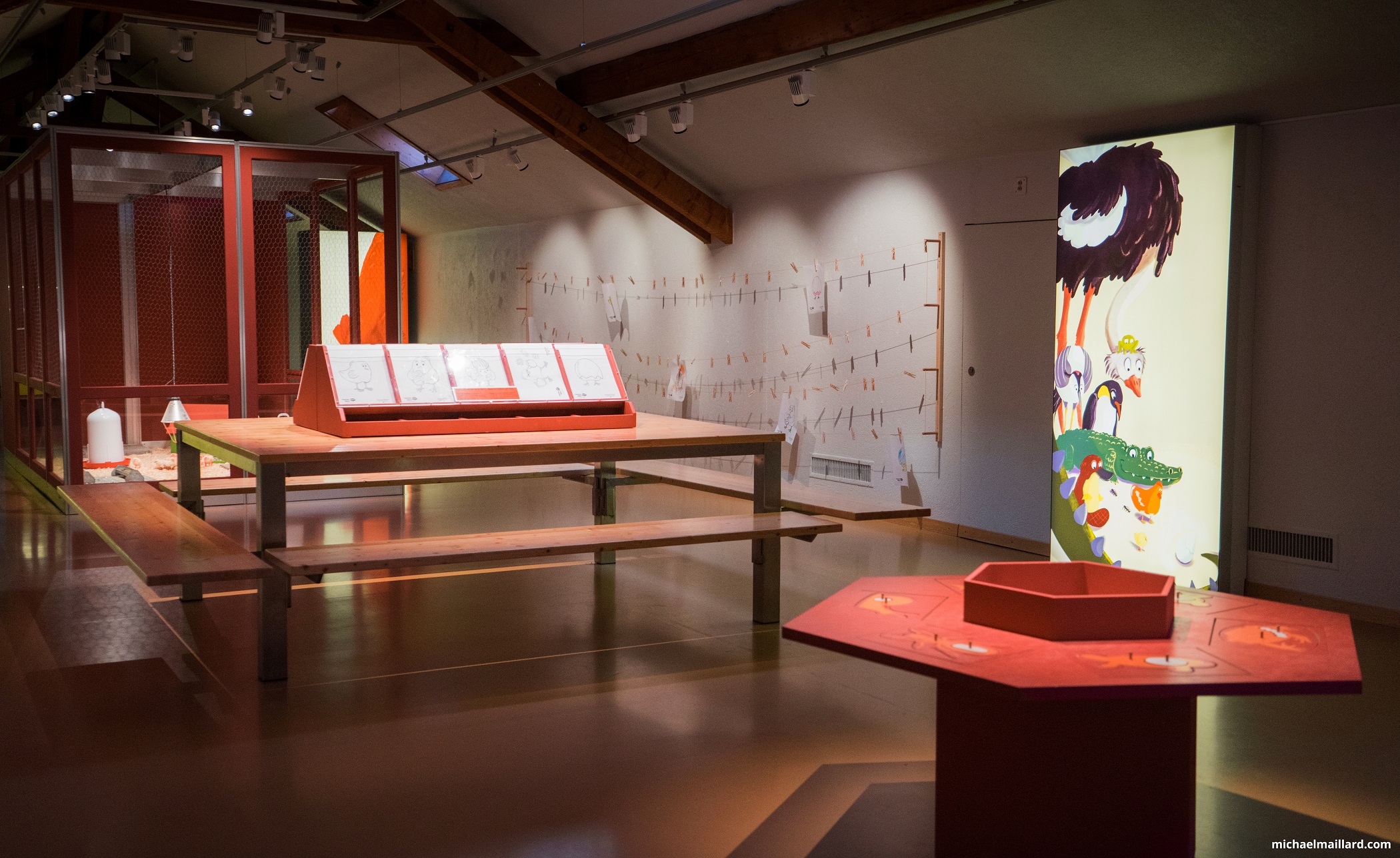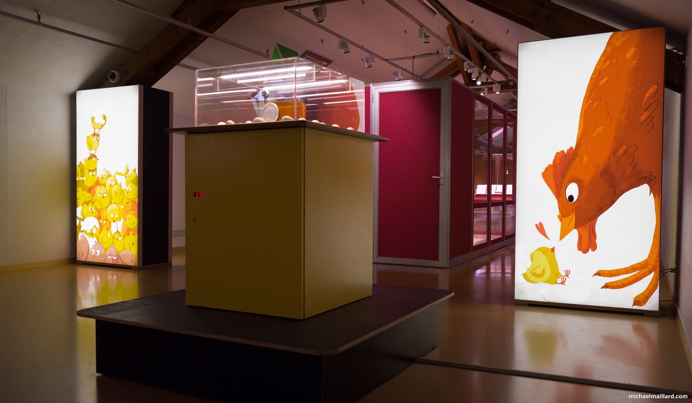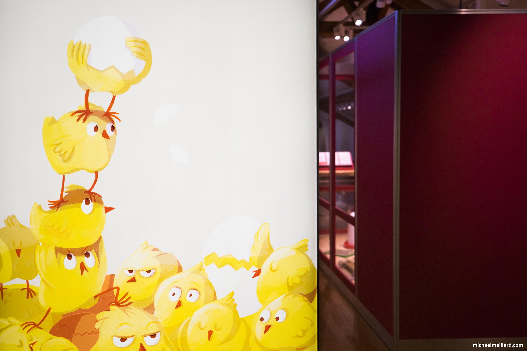 Observer la variété des oeufs et soulever des clapets pour découvrir qui les a pondu, presser sur des boutons pour comprendre les fonctions des différentes parties de l'oeuf, assembler des pièces de puzzle pour apprendre quels groupes d'animaux pondent des oeufs, regarder à l'intérieur d'un oeuf géant pour observer le développement de poussin, voilà autant de dispositifs mis en place pour expliquer sans mot, car l'exposition Poussins s'adressait tout particulièrement aux plus jeunes. Pour créer un univers qui leur soit proche, le Musée avait aussi collaboré avec Emma Wicht, une jeune artiste qui a déjà fait ses preuves dans l’illustration pour enfants. Le résultat était une exposition aux couleurs chaudes, peuplée de petites boules jaunes aux expressions loufoques.