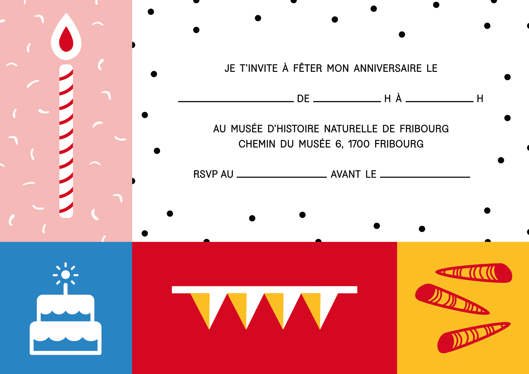 Tu es avide d'aventure et tu aimes les défis ? Viens fêter ton anniversaire au Musée d'histoire naturelle de Fribourg ! Au programme : un parcours animé dans le Musée, puis gâteau et ouverture des cadeaux dans une salle décorée.