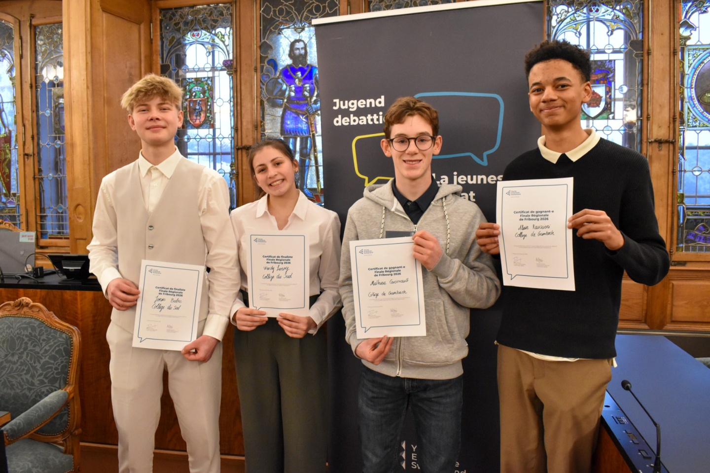 En outre, YES organise un concours national. Les élèves peuvent y participer par le biais d’une sélection au sein de l’école pour ensuite participer à une finale régionale comme celle de Fribourg et débattre avec d’autres équipes qui viennent d’autres écoles de la région.