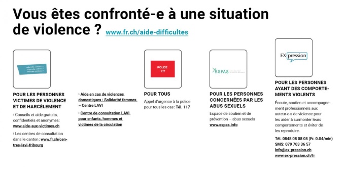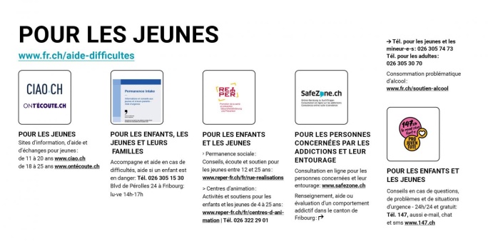- Tél. pour les personnes mineur-e-s: 026 305 74 73