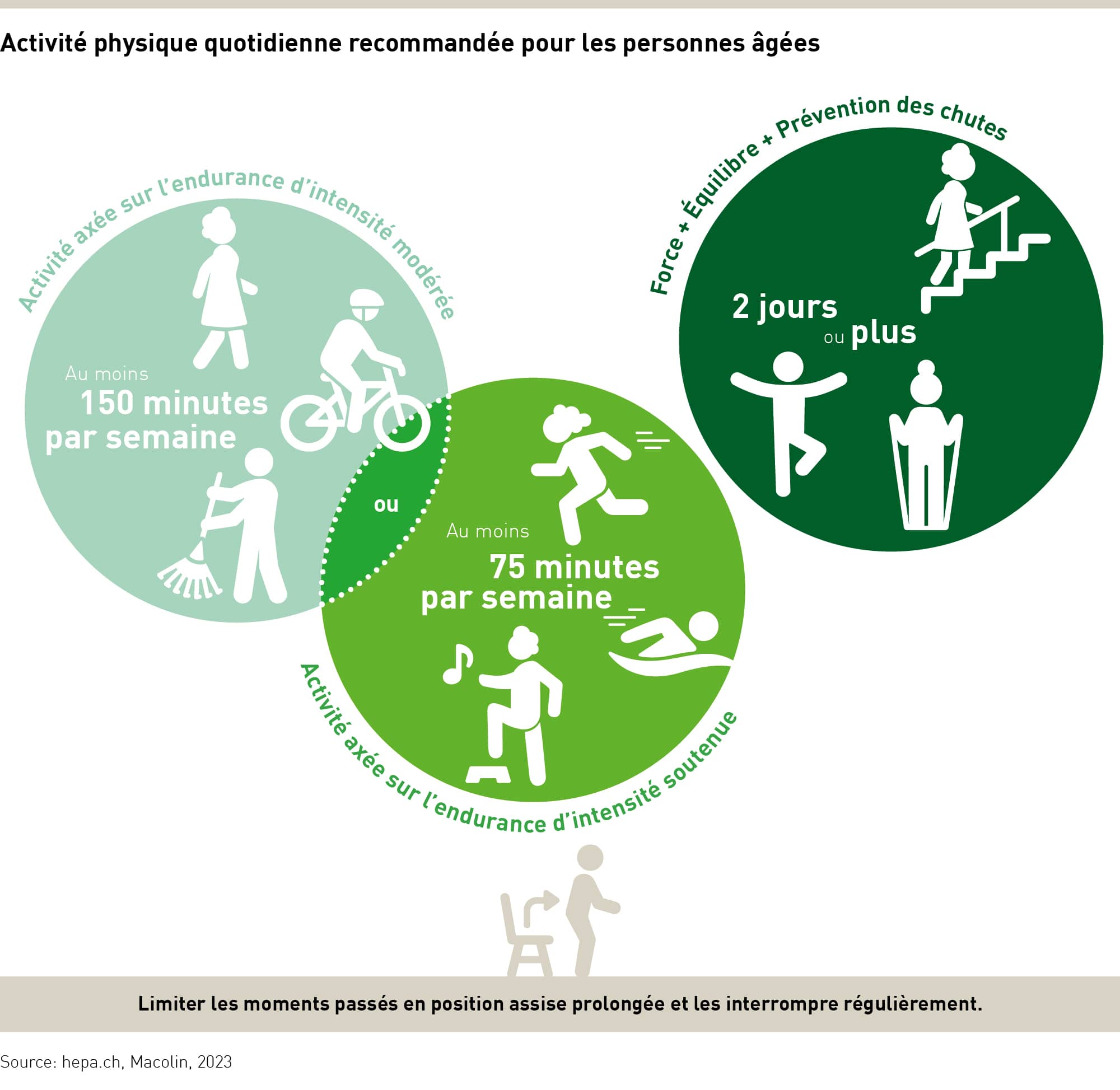 L’activité physique, adaptée à l’âge et à l’état de santé de la personne, représente un facteur de protection essentiel de la santé. L’activité physique contribue au maintien de l’indépendance dans les activités quotidiennes grâce à ses effets sur la musculature, l’équilibre, la force, l’endurance, la masse osseuse, ou encore les performances cognitives et le sommeil.