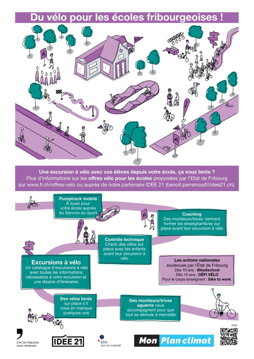Afin de promouvoir la mobilité douce, cette page réunit les différentes offres et projets dans le canton de Fribourg, qui s'adressent en particulier aux écoles et à leurs élèves. À vous de choisir et de combiner les offres :