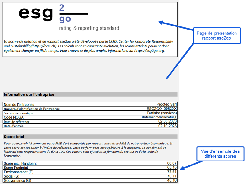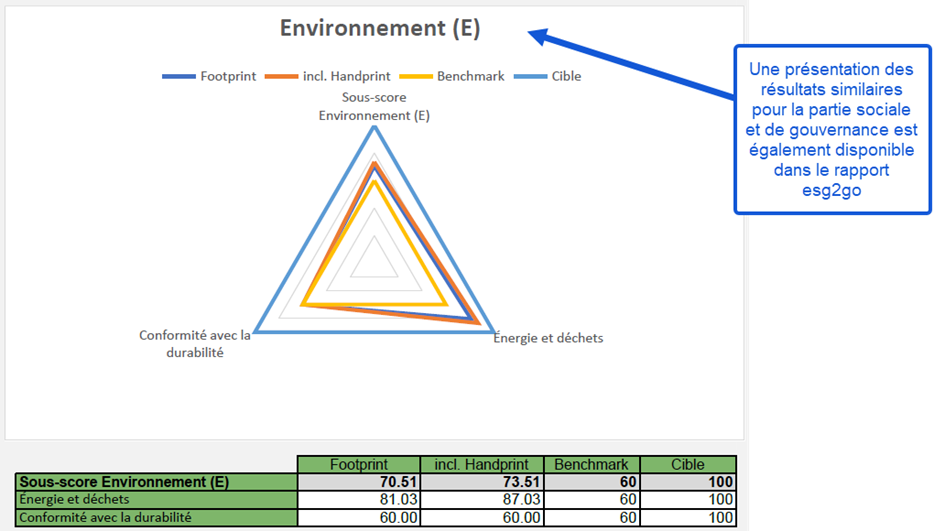 - Rapports esg2go : rapports de performance contenant les scores dans les domaines environnementaux, sociaux et de gouvernance, y.c. un benchmarking sectoriel