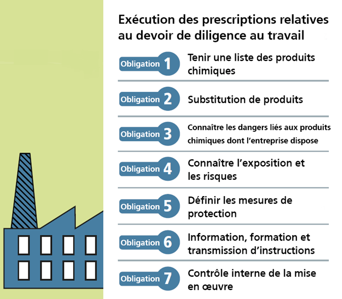 Le devoir de diligence établi dans l’article 8 de la Loi fédérale sur la protection contre les substances et les préparations dangereuses (Loi sur les produits chimiques, LChim) précise :« Quiconque utilise des substances ou des préparations doit tenir compte de leurs propriétés dangereuses et prendre les mesures nécessaires à la protection de la vie et de la santé. Il doit notamment tenir compte des informations fournies à ce sujet par le fabricant. »