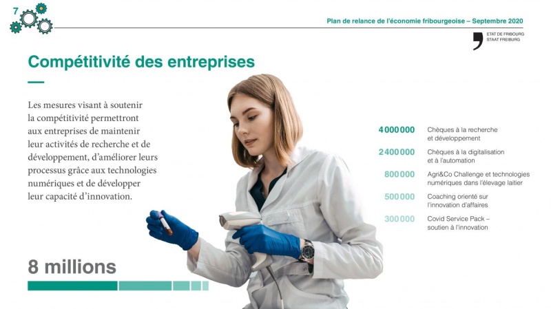 - Description de la mesure : l’objectif visé par la mesure est de permettre aux entreprises impactées par la crise sanitaire et économique de poursuivre leurs activités de recherche et de développement, afin d’accélérer leur retour à la compétitivité au sortir de la crise. Celles-ci pourront ainsi plus rapidement participer à la reprise économique et maintenir leurs investissements en R&D. La mesure consiste à prendre en charge 80% du salaire de collaborateurs-trices actifs-ves dans le domaine R&D de l’entreprise (5 personnes au maximum, avec un plafond fixé à 200 000 francs par entreprise).