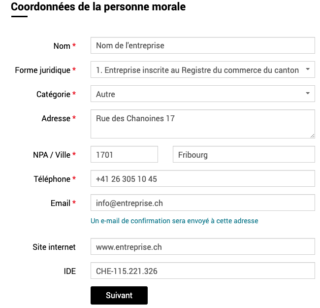 Agrandir Capture d'écran de l'écrans Coordonnées de la personne morale © Etat de Fribourg - Staat Freiburg