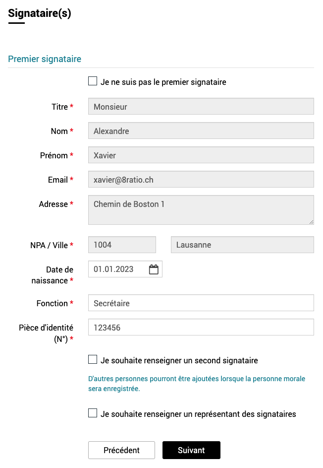 Le but de cet écran est d'indiquer quelles sont la ou les personnes dans l'entité juridique à avoir le droit de signature. La ou les personnes enregistrées devront alors signer l'inscription à l'issue de la procédure.