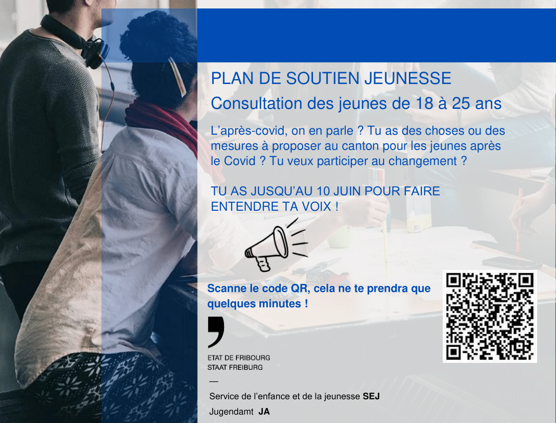 Le projet de consultation des jeunes s’étend de novembre 2021 jusqu’en août 2022 et se compose de trois étapes clés. La première étape a consisté en la création d’un groupe de travail composé de jeunes dont l’objectif était d’identifier les thématiques qui préoccupent actuellement les jeunes et sur lesquelles se base la suite de la consultation. Pour ce faire, plusieurs séances avec le groupe de travail ont eu lieu au mois de décembre dernier. Ces séances ont permis d’identifier huit thématiques clés (santé, liens sociaux, travail et études, espace public, loisirs et temps libre, avenir, participation, sources d’informations) qui ont servi de bases aux étapes 2 et 3. La deuxième étape du projet a consisté en trois ateliers participatifs au mois de février 2022 (15, 17 et 21 février). Leur objectif : identifier les questionnements, les enjeux et les attentes de la jeunesse tout en créant un espace de dialogue entre et avec les jeunes. La réalisation de ces ateliers est une opportunité pour eux/elles de s’exprimer sur ce qu’ils et elles ont vécu ces deux dernières années. La dernière étape concerne un sondage en ligne plus large réalisé auprès des jeunes. L’objectif de cette dernière étape est de récolter massivement des données quantitatives sur les nouvelles attentes, les nouveaux besoins et les revendications des jeunes du canton de Fribourg dans ce contexte pandémique. Ce sondage en ligne est diffusé auprès des jeunes durant le mois de mai 2022.