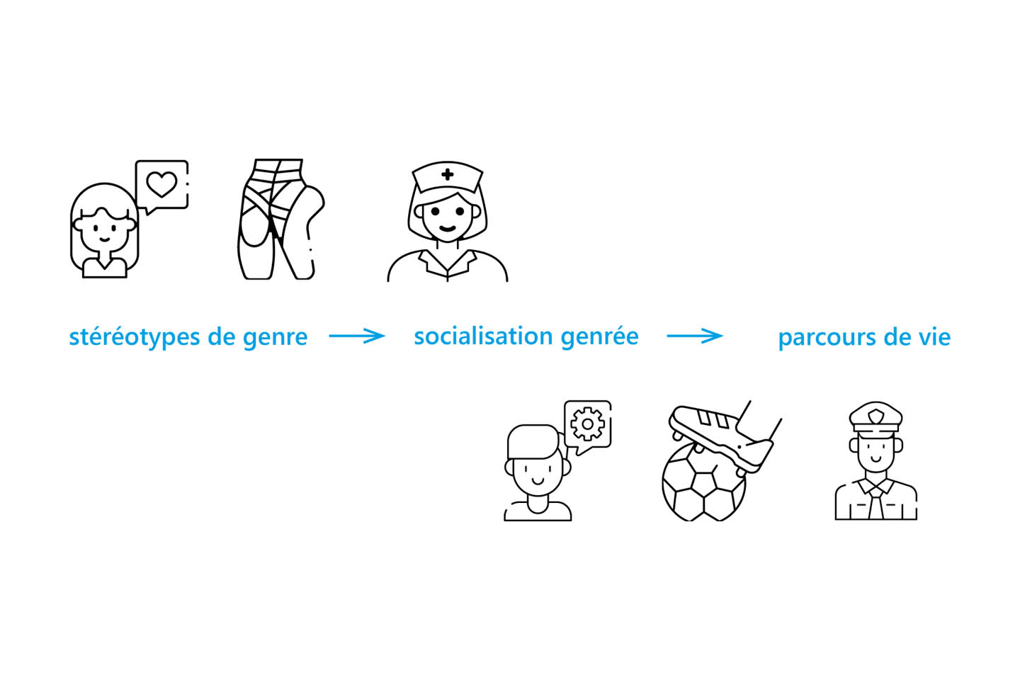 Même si l’égalité femmes-hommes est inscrite dans la loi, on constate dans la réalité que les garçons et les filles sont socialisés différemment et selon des stéréotypes de genre. Ceci influence leurs choix de vie, parfois au détriment de leurs propres aspirations et compétences personnelles.