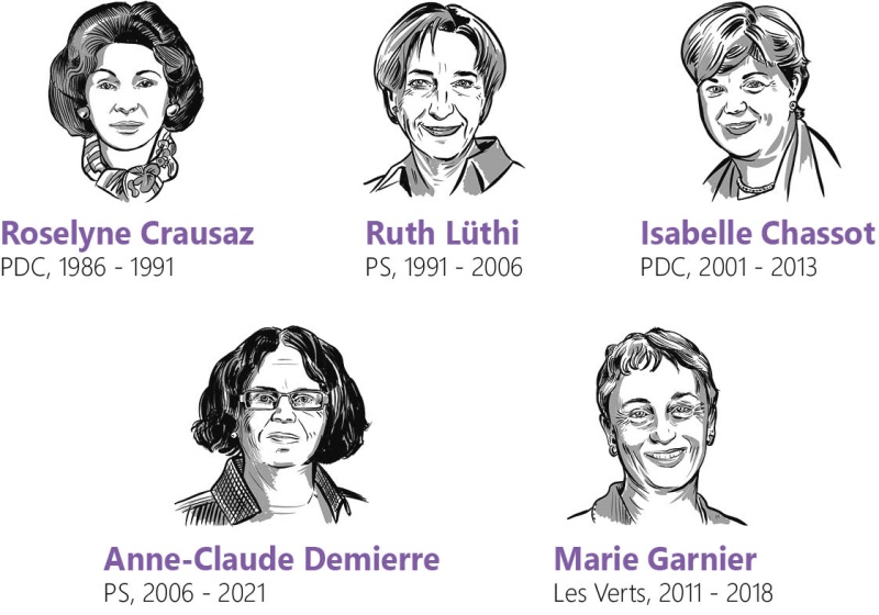 La première femme Conseillère d’Etat à Fribourg a été élue en 1986. Elles ont été 2 pendant une quinzaine d’années, et 3 pendant seulement quelques mois (2011 -2013). En 2021, 1 femme est Conseillère d’Etat.